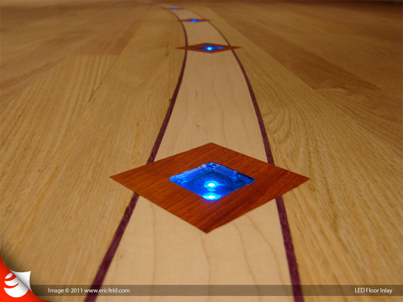 The final product. Red Oak flooring with a wood inlay consisting of maple, purple heart, and padauk. Inside each padauk square is a blue glass tile illuminated by a single surface mount LED.