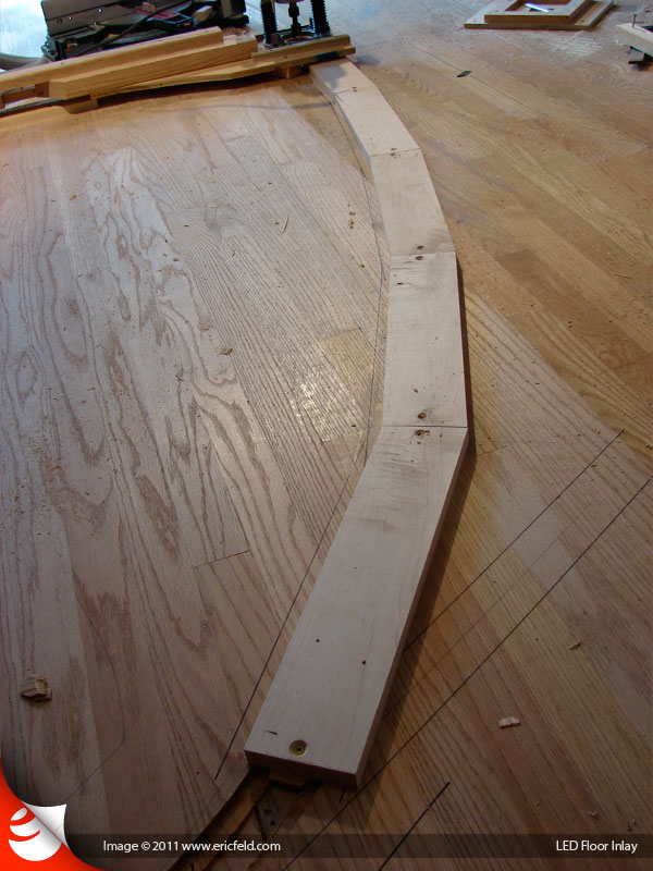 After routing two different levels of channel into the floor, we cut rough pieces of maple that would fit inside the channel. Lots of mathematical calculation went into determining how many pieces to cut, at what length, and how to miter their ends just right so that they lined up perfectly along the ellipse.