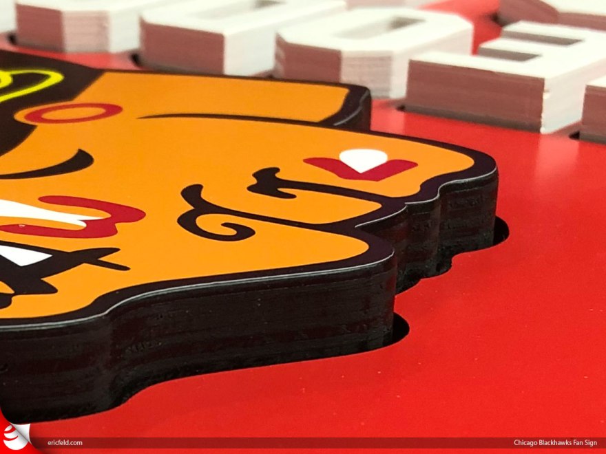As usual, I was presented with a last minute Christmas gift creation this year. When a family of 6 is passionate about their Chicago Blackhawks, what do you get them for Christmas? Autographed pictures? Hockey pucks from scoring a goal? Season tickets? I guess that stuff is too clichè, which is why she came to me for ideas. So I came up with this…..a 12”x24” custom personalized plaque made of plywood. Letters and Blackhawk head are separate elements that are somewhat recessed into the plywood. Take a look!